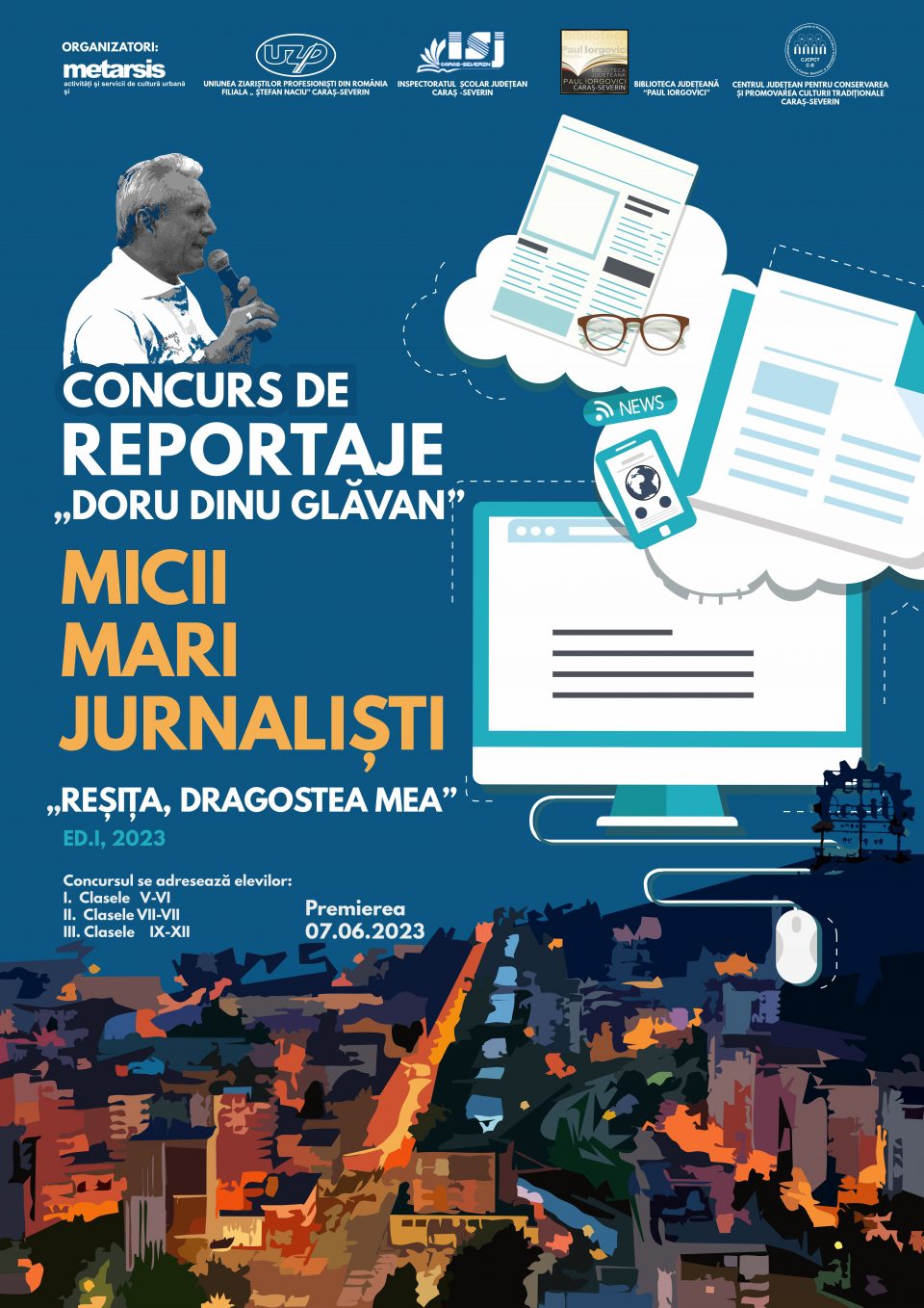 Societatea pentru Cultură METARSIS, Uniunea Ziariştilor Profesioniști din România- Filiala Caraş-Severin (UZPR CS), Inspectoratul Şcolar Județean Caraș-Severin, Biblioteca Județeană „Paul IORGOVICI” Caraş-Severin, Centrul Județean pentru Conservarea şi Promovarea Culturii Tradiționale Caraş-Severin, organizează, la Reșița, CONCURS DE REPORTAJE „DORU DINU GLĂVAN” – „Micii mari jurnalişti”, ed.l, 2023, „Reşita, dragostea mea”.
