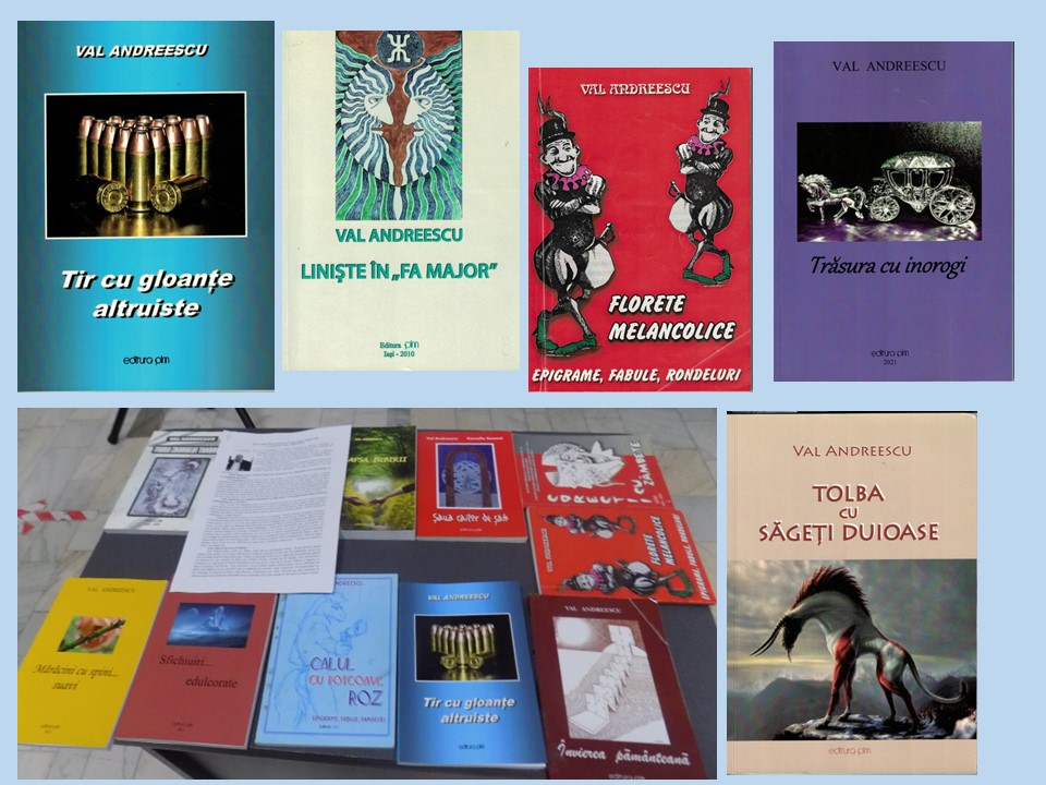 Au fost dăruite participanților cărți, ce au purtat semnătura scriitorului și jurnalistului VAL ANDREESCU. Va trăi prin cărțile sale, acolo unde sufletul se regăsește la fiecare pagină, așa cum spune Maxim Gorki: „Fiecare carte pare că închide în ea un suflet. Şi, cum o atingi cu ochii şi mintea, sufletul ţi se deschide ca un prieten bun.”