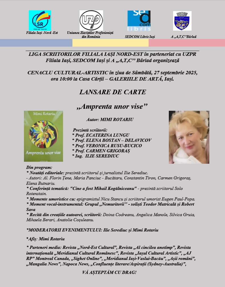 Acest important centru cultural al Iașului a găzduit, în data de 27 septembrie a anului curent, ședința Ligii Scriitorilor – filiala Iași Nord- Est, ședință în cadrul careie a avut loc un eveniment cultural de excepție: Lansarea volumului de poezie „Amprenta unor vise” creație de valoare a scriitoarei, poetei și totodată Secretarei Ligii Scriitorilor din Iași, doamna Mimi Rotariu.