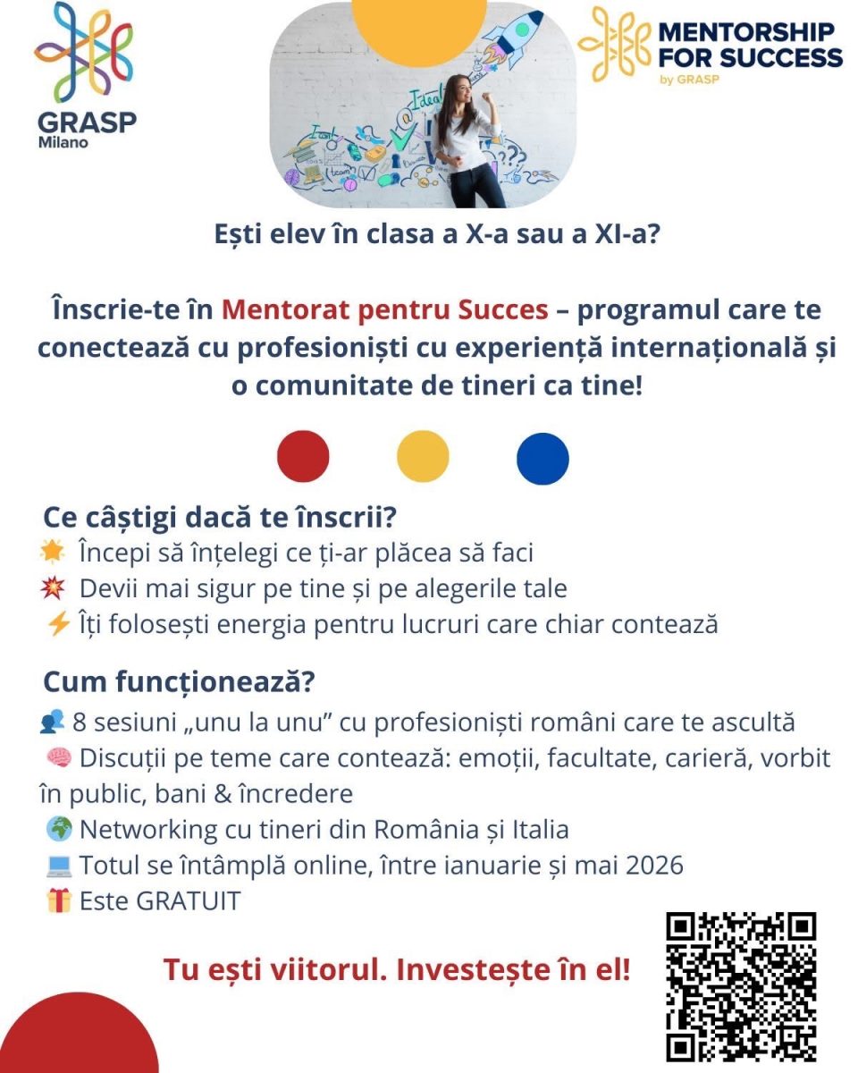 GRASP Milano a deschis oficial selecția pentru a VII-a ediție a programului „Mentorat pentru Succes”, adresat elevilor români de 16–17 ani. Programul a fost premiat în 2025 drept “Cel mai bun proiect pentru tineri realizat în diaspora” la Gala de Excelență “Lideri pentru Liderași” organizată anual de Radio Itsy Bitsy România și a ajutat peste 100 de adolescenți să se dezvolte personal, alături de profesioniști români din Italia și nu numai.