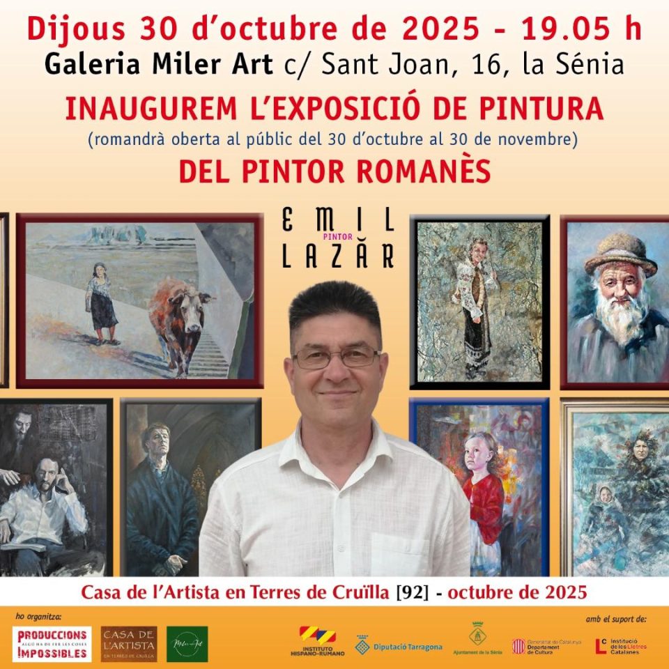 Joi, 30 octombrie 2025, la Galeria Miler Art din La Sénia, a avut loc vernisajul expoziției „Tradiție și actualitate”, semnată de pictorul român Emil Lazăr, un eveniment cultural de mare intensitate emoțională organizat de Institutul Hispano‑Român și Galeria Miler Art, cu sprijinul Primăriei La Sénia, Consiliului Provincial Tarragona, Consilieriei pentru Cultură din cadrul Guvernului Cataloniei și Casei Artistului din La Sénia.