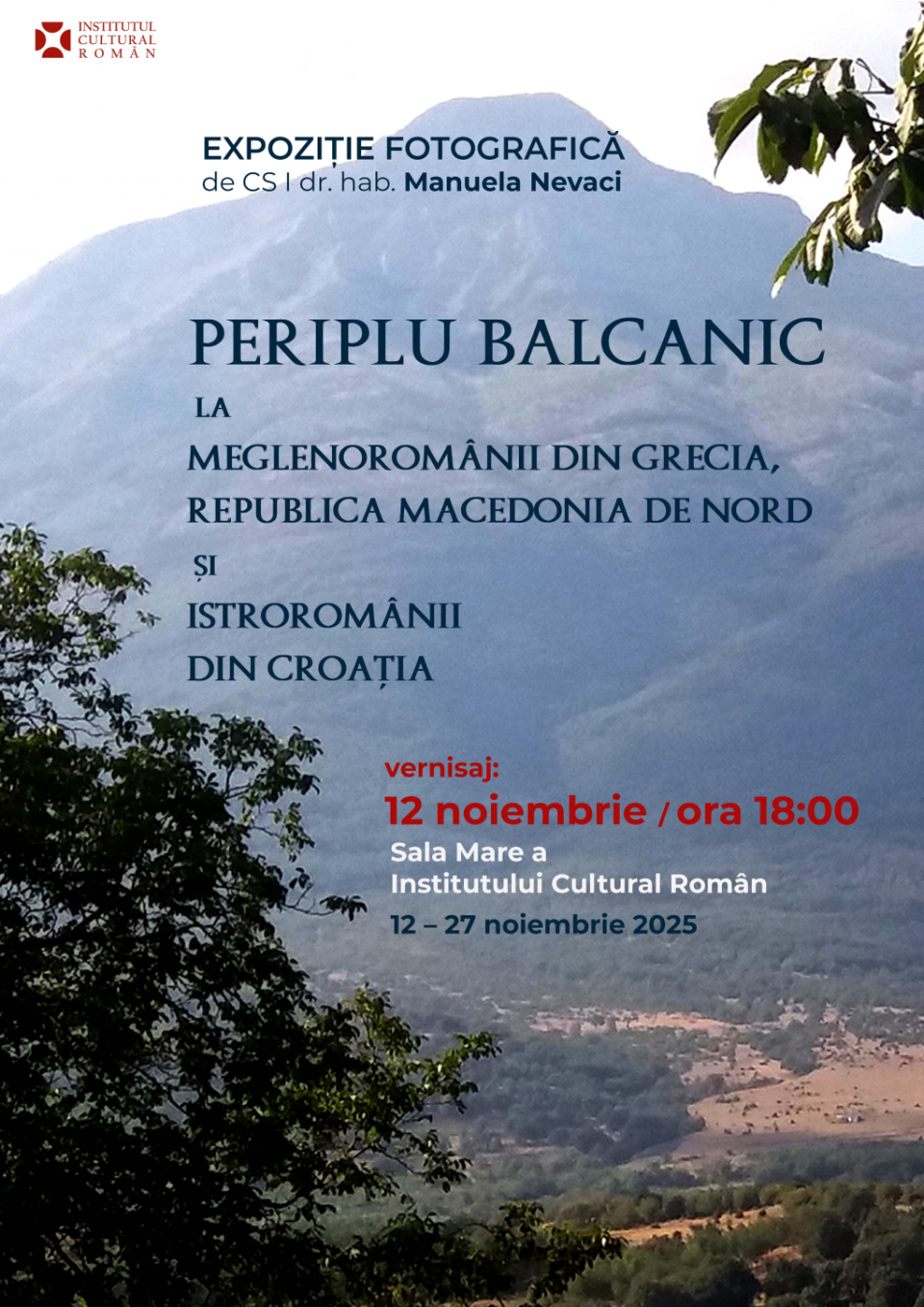 Institutul Cultural Român organizează expoziția fotografică „Periplu balcanic la meglenoromânii din Grecia și Republica Macedonia de Nord și istroromânii din Croația”, în parteneriat cu Societatea de Cultură Macedo-Română, în perioada 12-27 noiembrie 2025. Accesul vizitatorilor este liber.