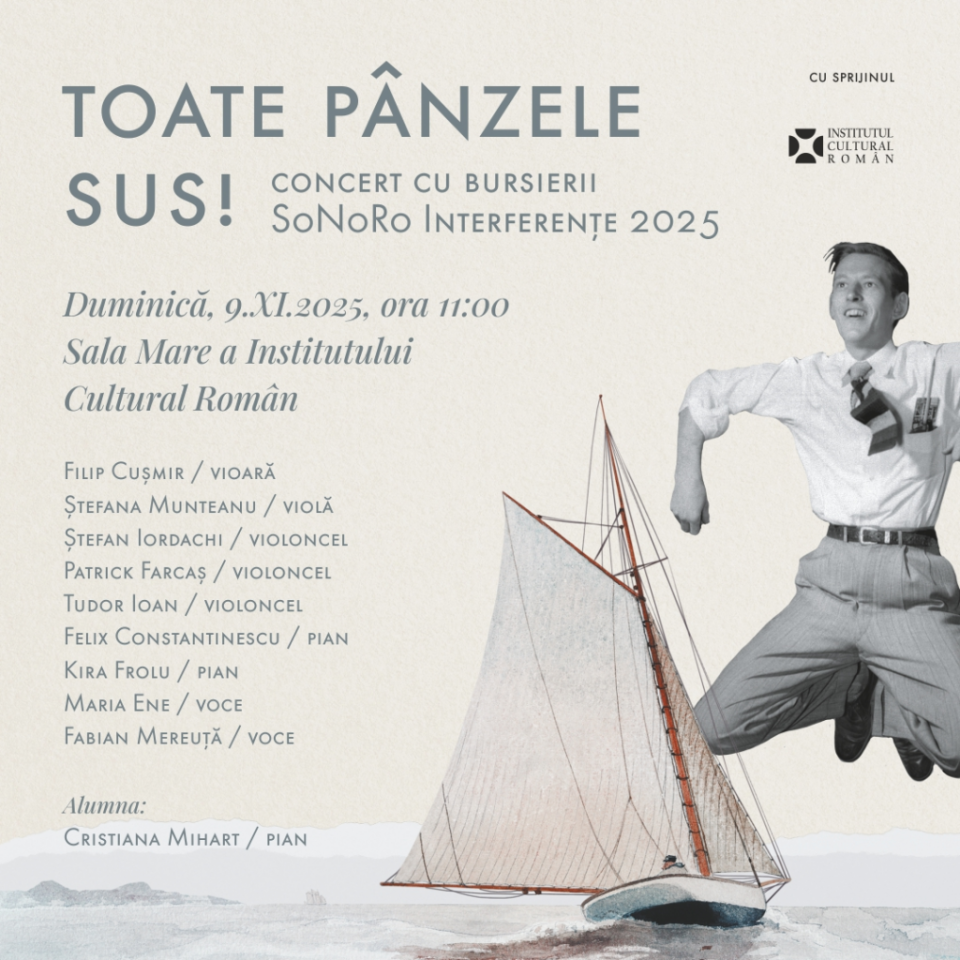 Institutul Cultural Român și Festivalul SoNoRo invită publicul duminică, 9 noiembrie 2025, de la ora 11:00, în Sala Mare a ICR, la un concert extraordinar intitulat „Toate pânzele sus!” susținut de bursierii SoNoRo Interferențe 2025.