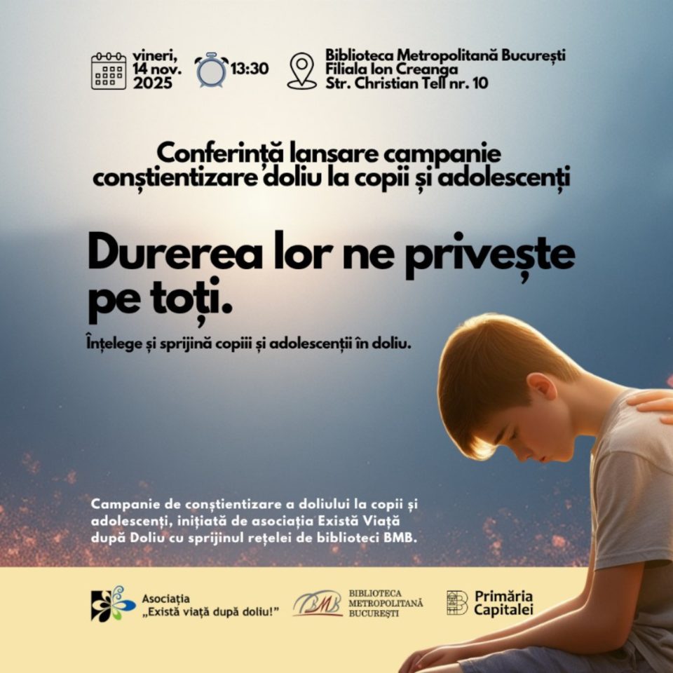 Primăria Municipiului București, prin Biblioteca Metropolitană București, în parteneriat cu Asociația „Există viață după doliu”, vă invită la Conferința de Presă organizată vineri, 14 noiembrie 2025, începând cu ora 13:30, la Filiala Ion Creangă, Str. Christian Tell nr. 10.
