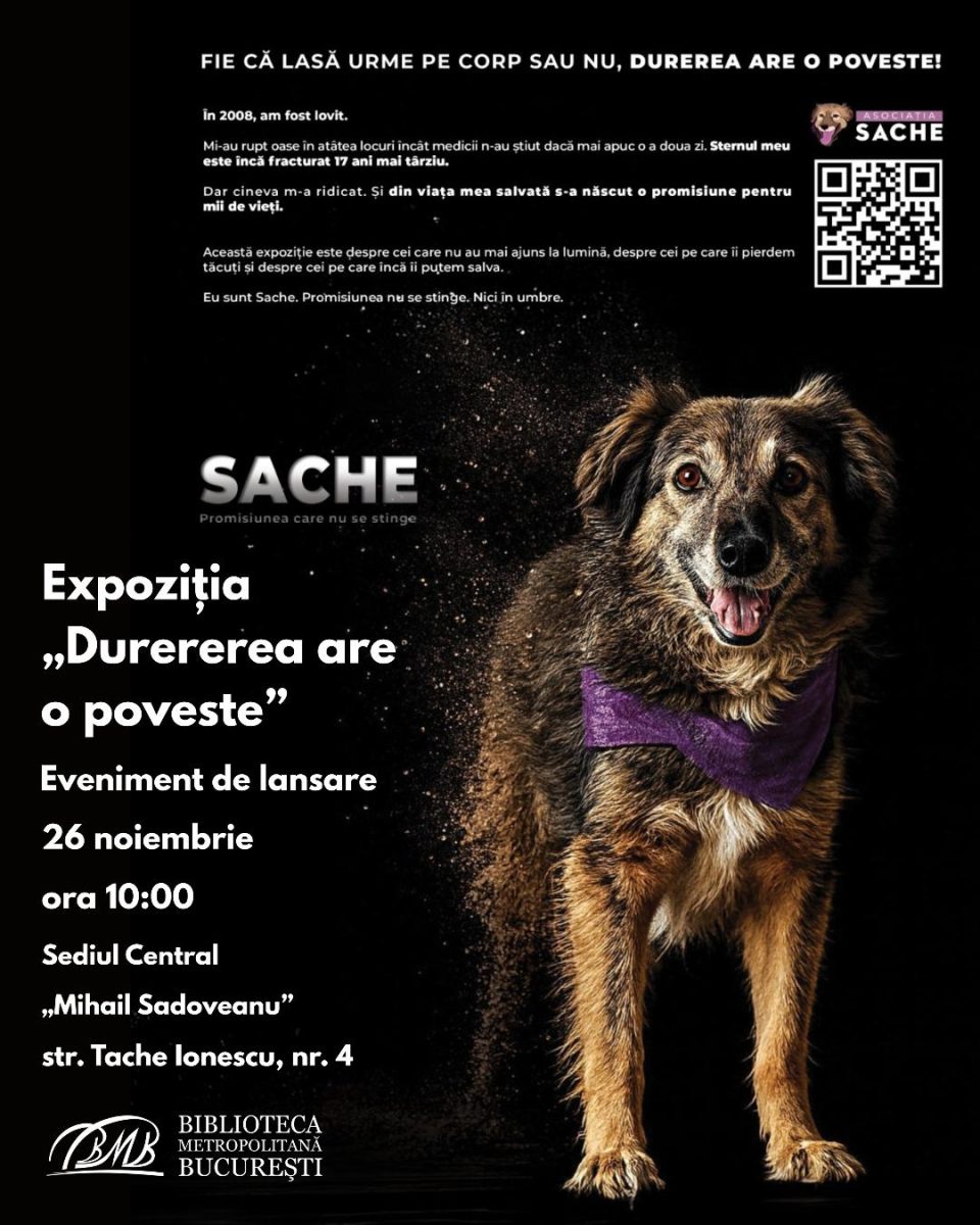 Primăria Municipiului București (PMB), prin Biblioteca Metropolitană București (BMB), în parteneriat cu Asociația Sache, anunță deschiderea expoziției fotografice outdoor „Durerea are o poveste”, un proiect ce promovează respectul, empatia și responsabilitatea față de toate formele de viață.