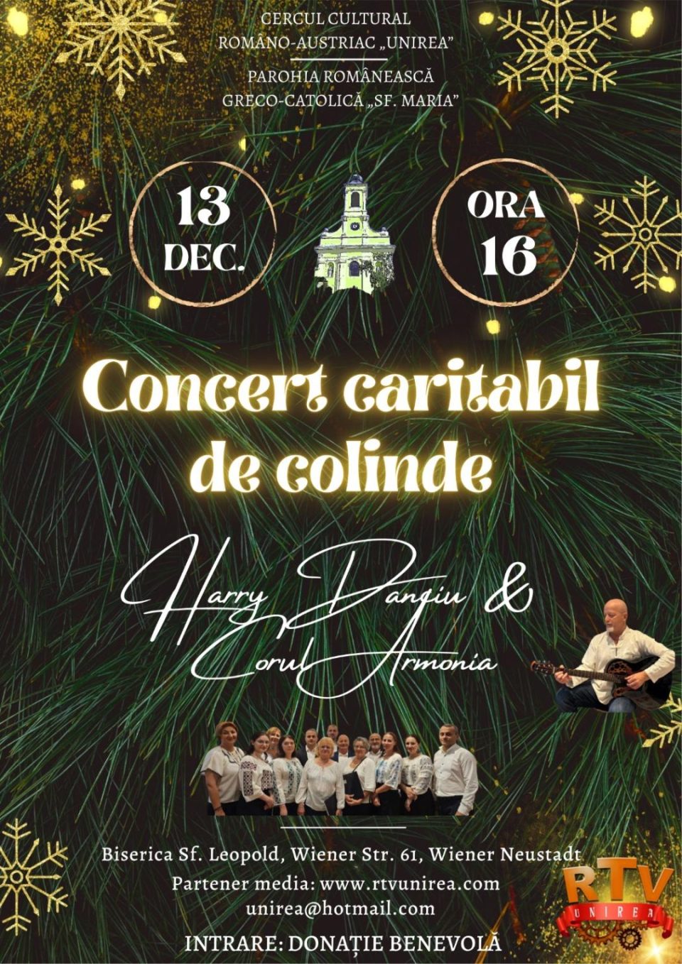 Comunitatea românească din Austria este invitată la un eveniment cultural deosebit: Concertul Caritabil de Crăciun „Colind pentru Inimi”, care va avea loc sâmbătă, 13 decembrie 2025, de la ora 16:00, cu accesul publicului de la 15:30, la Biserica St. Leopold, Wiener Straße 61, A-2700 Wiener Neustadt.