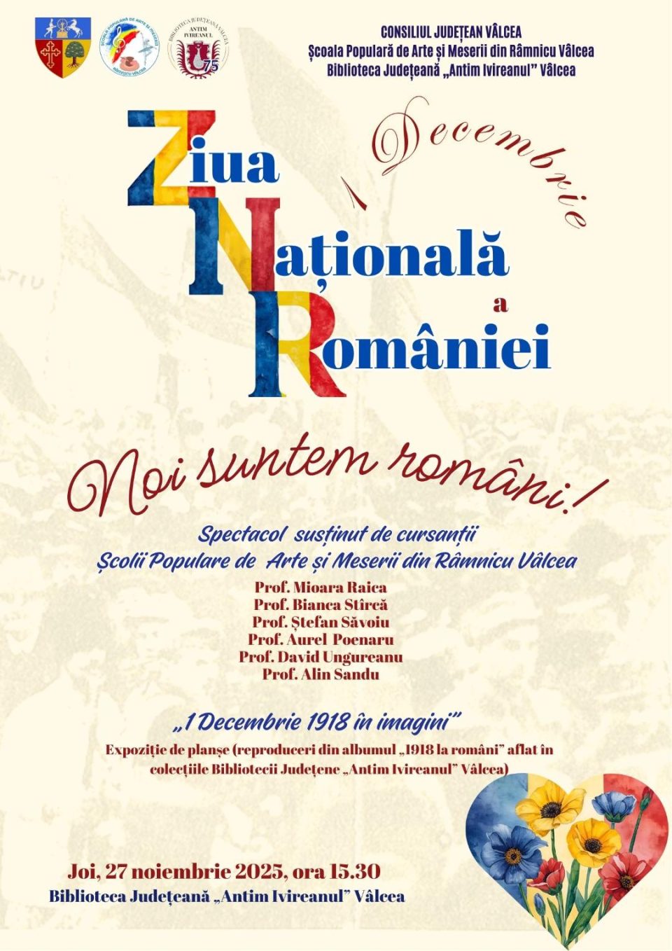 Va asteptam cu mare drag joi, 27 noiembrie 2025, ora 15.30, la Biblioteca Județeană „Antim Ivireanul” Vâlcea, să sărbătorim în avans ZIUA NAȚIONALĂ A ROMÂNIEI, prin evenimentul cultural „Noi suntem români!”