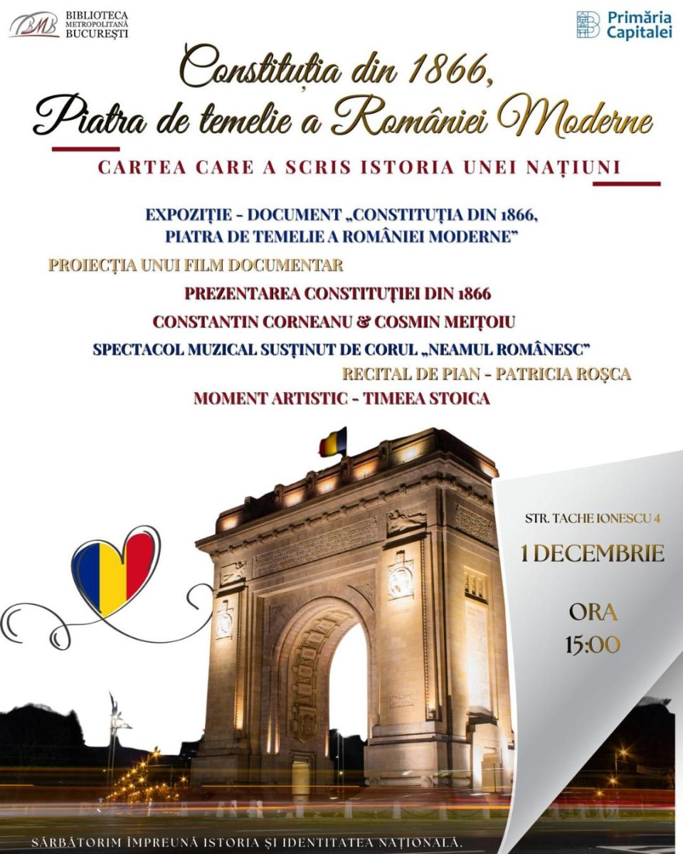 Primăria Municipiului București, prin Biblioteca Metropolitană București, vă invită luni 1 decembrie 2025, începând cu ora 15:00, la Sediul Central „Mihail Sadoveanu”, la deschiderea expoziției-document „Constituția din 1866, piatra de temelie a României moderne”, un eveniment special organizat cu prilejul Zilei Naționale a României.