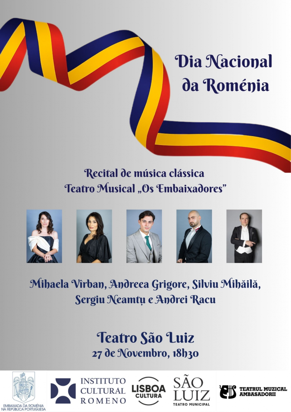 Institutul Cultural Român de la Lisabona și Ambasada României în Republica Portugheză au marcat Ziua Națională a României joi, 27 noiembrie 2025, la Teatrul São Luiz din capitala Portugaliei, printr-un concert susținut de artiștii Teatrului Muzical „Ambasadorii”. Repertoriul, în care s-au regăsit lucrări semnate de compozitori români și internaționali, precum Filaret Barbu, Paul Constantinescu, Gherase Dendrino, George Grigoriu, Jacques Offenbach, Franz Lehar, W. A. Mozart, Camille Saint-Saens și Franz Schubert, a fost interpretat de Mihaela Vîrban (soprană), Andreea Grigore (mezzosoprană), Silviu Mihăilă (bariton), Sergiu Neamțu (bas-bariton) și Andrei Racu (pianist).