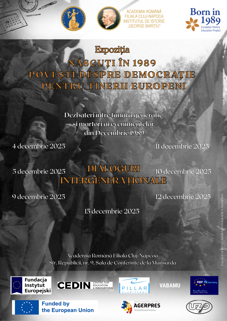 La Academia Română Filiala Cluj-Napoca, seria de dialoguri îi are ca invitați pe prof. univ. dr. Eugen Mortiz, Tiberiu Iordan, Răzvan Rotta, Vasile Măgrădean, Tiberiu Fărcaș, conf. univ. dr. Rareș Beuran și acad. Ioan Aurel Pop, care se vor întâlni cu elevi și studenți, pentru a rememora rolul tinerilor în Revoluția din 1989 și pentru a discuta despre importanța angajamentului civic în fața marilor momente de schimbare. Discuțiile, cu o durată de aproximativ 60 de minute, vor avea loc la sediul Filialei clujene a Academiei Române (str. Republicii, nr. 9, în sala de conferințe de la mansardă) și se vor desfășura în jurul expoziției internaționale de fotografie Născuți în 1989 – Povești despre democrație pentru tinerii europeni. Expoziția surprinde, prin 30 de imagini, implicarea tinerilor din șase țări europene fost comuniste în momentele decisive ale anului 1989 și oferă o perspectivă vizuală complexă asupra activismului, curajului și dorinței de libertate.