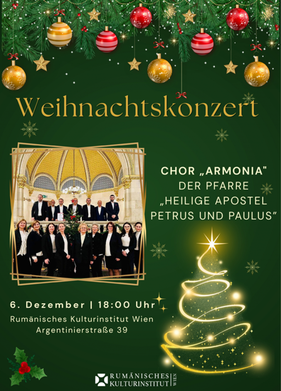 Un concert de colinde susținut de Corul „Armonia“ al parohiei greco-catolice românești „Sfinții Apostoli Petru și Pavel”, din cartierul vienez Kagran, va avea loc la Institutul Cultural Român de la Viena sâmbătă, 6 decembrie 2025, de ora 18.00. Evenimentul aduce pe scenă unul dintre cele mai îndrăgite coruri românești din capitala Austriei, reunind interpreți sub bagheta dirijorului Bogdan Gabriel Popescu. Programul muzical cuprinde colinde tradiționale românești cu profunde rădăcini liturgice – precum „Sus, boieri, nu mai dormiți”, „Plecarea magilor”, „Domnul Isus Hristos” sau „Praznic luminos” – alături de creații populare moderne devenite emblematice, precum „Moș Crăciun” sau „O, brad frumos”. Repertoriul este completat de cântece internaționale de Crăciun, oferind astfel o deschidere interculturală care pune în dialog tradiții muzicale diferite, unite prin aceeași temă centrală: celebrarea Nașterii Domnului.