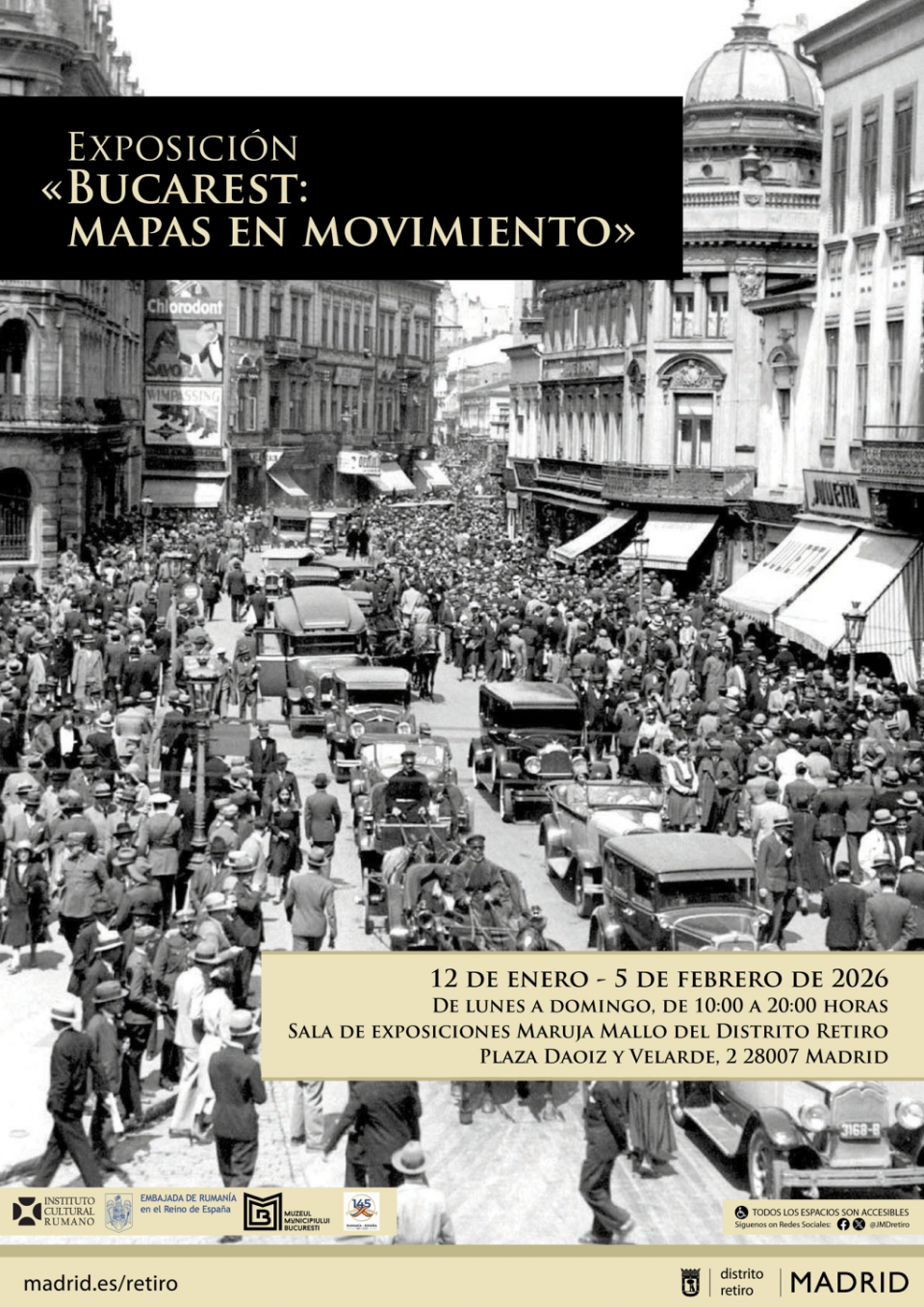 Institutul Cultural Român de la Madrid, în parteneriat cu Muzeul Municipiului București, sub auspiciile Ambasadei României din Regatul Spaniei, cu sprijinul Districtului Retiro al municipalității Madrid, organizează prima expozitie din 2026, „Bucureşti: hărți în mișcare”, cu ocazia Zilei Culturii Naționale. Curatoriată de istoricii Adrian Majuru și Dan Pîrvulescu, expoziția prezintă atât fotografii de arhivă, cu Bucureștiul de odinioară, cât și fotografii care surprind capitala în faza ei actuală, realizate de Dragoș Asaftei.