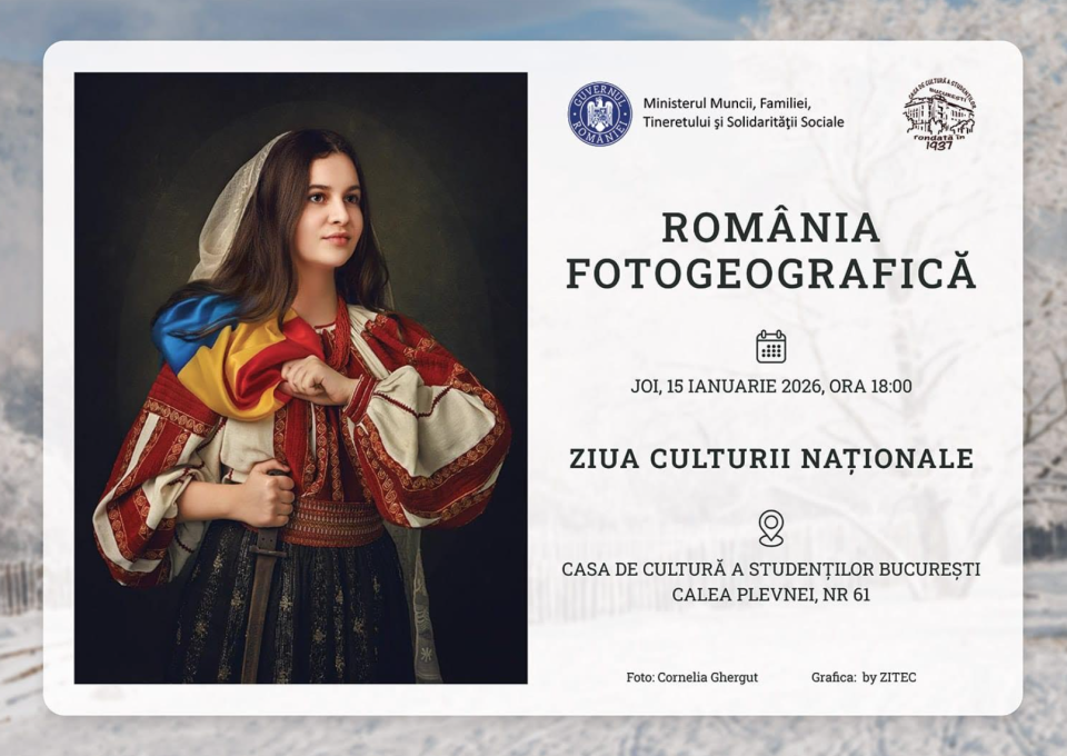 Casa de Cultură a Studenţilor Bucureşti, organizează joi, 15 ianuarie 2026, ora 18:00, evenimentul expozițional intitulat ROMÂNIA FOTOGEOGRAFICĂ. Expoziția aduce în fața publicului lucrări din galeria Fotogeografica, care ilustrează momente din lumea satului românesc și a naturii în anotimpul de iarnă.