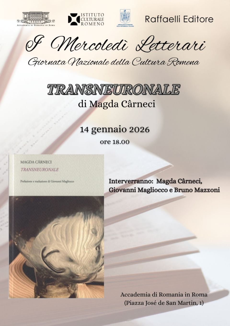 Miercuri, 14 ianuarie 2026, la ora 18:00, vă așteptăm la prezentarea primei antologii de poezie în limba italiană a scriitoarei Magda Cârneci, TRANSNEURONALE, ediție bilingvă publicată de Raffaelli Editore, în traducerea și cu prefața profesorului Giovanni Magliocco. La întâlnire vor vorbi, alături de autoare, traducătorul volumului și profesorul Bruno Mazzoni, recunoscut cercetător al literaturii române și traducător multiplu premiat.