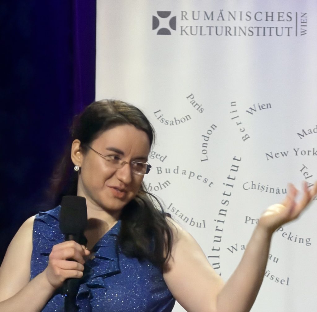 A urmat Mag. Andreea Dincă, directoarea Institutului Cultural Român din Viena, care a vorbit despre rolul culturii ca limbaj universal și despre misiunea ICR de a așeza valorile românești într-un dialog viu cu spațiul cultural european. Cu naturalețe și eleganță, aceasta a invitat-o pe scenă pe protagonista serii.