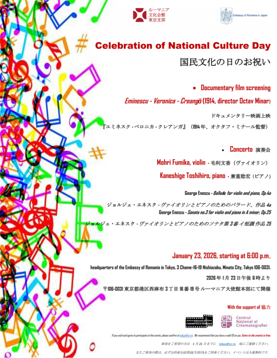 Institutul Cultural Român de la Tokyo organizează în data de 23 ianuarie 2026, ora 18.00, la sediul Ambasadei României din Japonia, proiecția filmului documentar Eminescu – Veronica – Creangă (1914), regia Octav Minar, și un recital de muzică de cameră susținut de  Fumika Mohri (vioară) și Toshihiro Kaneshige (pian). Program recitalului va include două lucrări de George Enescu: Baladă pentru vioară și pian, Op.4a și Sonata nr. 3 pentru vioară și pian în A minor, Op.25