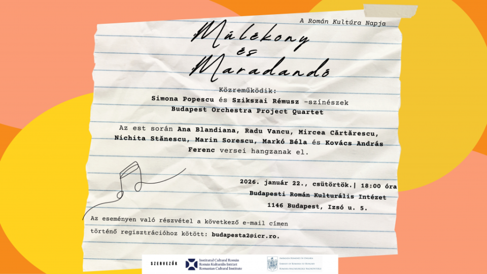 Institutul Cultural Român de la Budapesta și Filiala sa de la Seghedin marchează Ziua Culturii Naționale prin proiectul interdisciplinar „EFEMER_NON EFEMER: Între literatură și teatru”, prezentat publicului în două variante de interpretare. Selecția literară reunește texte semnate de autori de referință din literatura română și maghiară: Ana Blandiana, Radu Vancu, Mircea Cărtărescu, Nichita Stănescu, Marin Sorescu, Markó Béla și Kovács András Ferenc.