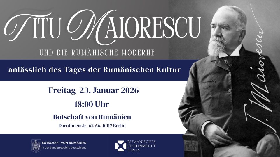 | „Titu Maiorescu und die rumänische Moderne“Podiumsdiskussion anlässlich des Tages der Rumänischen KulturDas Rumänische Kulturinstitut „Titu Maiorescu“ Berlin veranstaltet, in Zusammenarbeit mit der Botschaft von Rumänien in der Bundesrepublik Deutschland, anlässlich des Tages der Rumänischen Kultur, eine Podiumsdiskussion zum Thema „Titu Maiorescu und die rumänische Moderne“. Termin und Ort: Freitag, 23. Januar, 18:00-20:00 Uhr,Botschaft von Rumänien, Dorotheenstr. 62-66, 10117 Berlin. Als Ehrengäste nehmen teil:Dr. h. c. Emil Hurezeanu, Schriftsteller, Publizist und DiplomatProf. Dr. Mircea Martin, Literaturkritiker und -theoretiker, EssayistProf. Dr. Liviu Papadima, Literaturhistoriker und -theoretiker, Essayist Die Podiumsdiskussion widmet sich der akademischen und diplomatischen Tätigkeit Titu Maiorescus – von seinem Studium in Berlin und der Promotion in Gießen bis zu seiner diplomatischen Tätigkeit in der deutschen Hauptstadt – sowie seiner engen geistigen Verbindung zum rumänischen Nationaldichter Mihai Eminescu. Thematisiert werden ihre Freundschaft, ihr gegenseitiger Einfluss auf Literatur und Denken sowie ihr Beitrag zur Herausbildung eines modernen kulturellen Selbstverständnisses Rumäniens in Europa.Zugleich wird Maiorescus besondere Beziehung zu Deutschland als prägender Raum seiner kulturellen und europäischen Orientierung beleuchtet, ebenso wie seine Förderung Eminescus während dessen Studienaufenthalts in Berlin. Die Beziehung zwischen Maiorescu und Eminescu, getragen von gegenseitiger Wertschätzung und intellektueller Förderung, gilt bis heute als zentraler Bezugspunkt für das Verständnis der rumänischen kulturellen Moderne. Die Podiumsdiskussion wird musikalisch von Simina Croitoru (Violine) und Mădălin Voicu Jr. (Klavier) umrahmt, mit Werken von Mircea Chiriac, Fritz Kreisler, Ciprian Porumbescu, Grigoraș Dinicu und George Enescu. Teilnahme nur nach vorheriger Anmeldung, vorbehaltlich verfügbarer Plätze, per E-Mail an: berlin.rsvp@mae.ro |