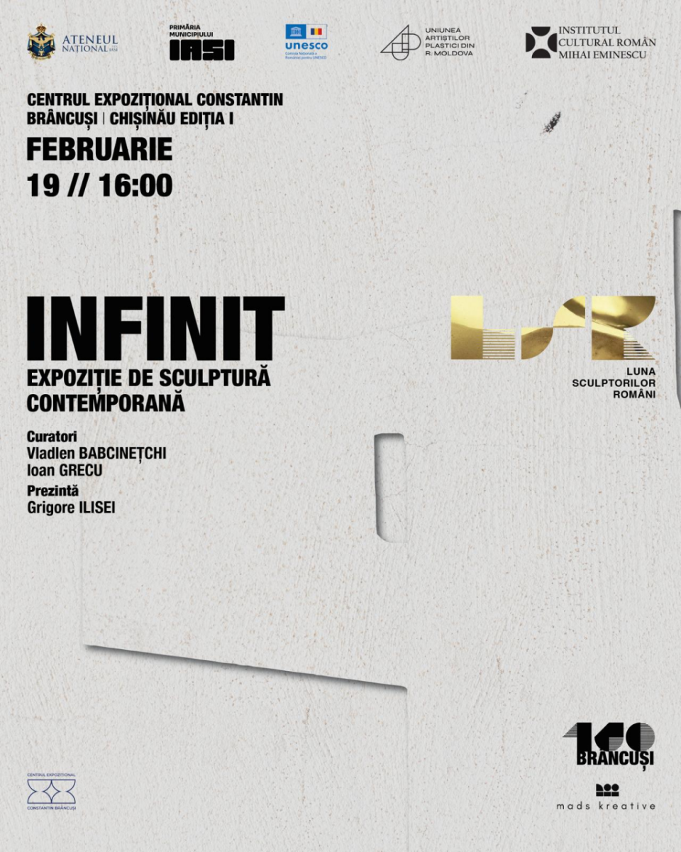 În perioada 19 februarie – 19 martie 2026, Institutul Cultural Român „Mihai Eminescu” este partener al evenimentului de sculptură contemporană „INFINIT – Brâncuși și transgresarea hotarelor”, organizat la Centrul Expozițional „Constantin Brâncuși” din Chișinău, vernisajul acestuia având loc joi, 19 februarie 2026, ora 16.00.