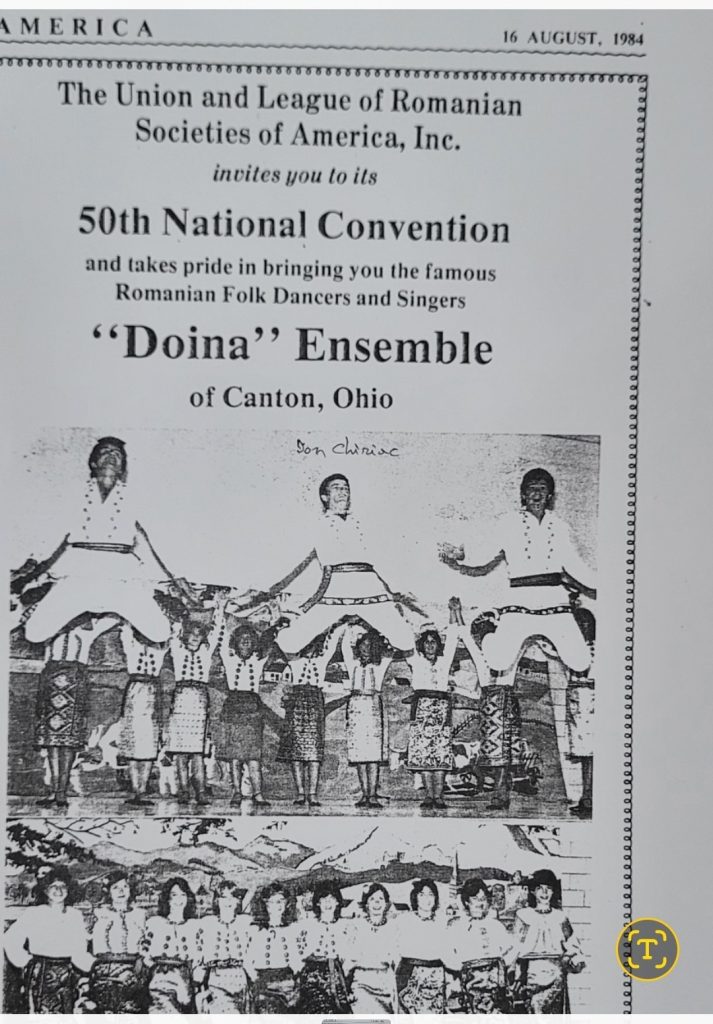 În pagină, Ansamblul folcloric „Doina” din Canton, Ohio era prezentat drept „faimosul ansamblu de dansuri și cântece populare românești”, invitat să reprezinte cultura română în fața comunității româno-americane.