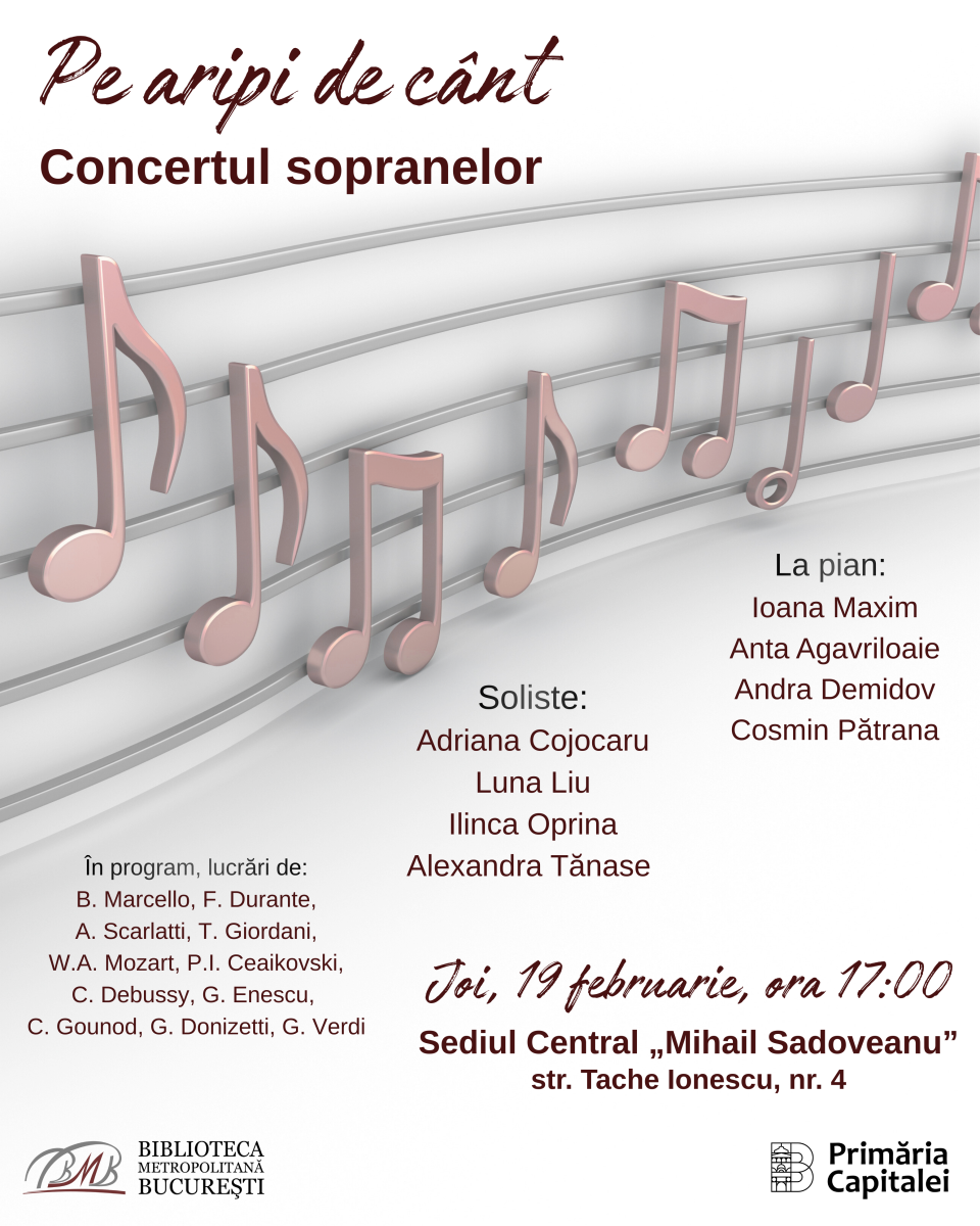 Primăria Municipiului București, prin Biblioteca Metropolitană București (BMB), invită publicul joi, 19 februarie 2026, de la ora 17:00, la recitalul „Pe aripi de cânt – Concertul sopranelor”, organizat la Sediul Central „Mihail Sadoveanu” (str. Tache Ionescu nr. 4).