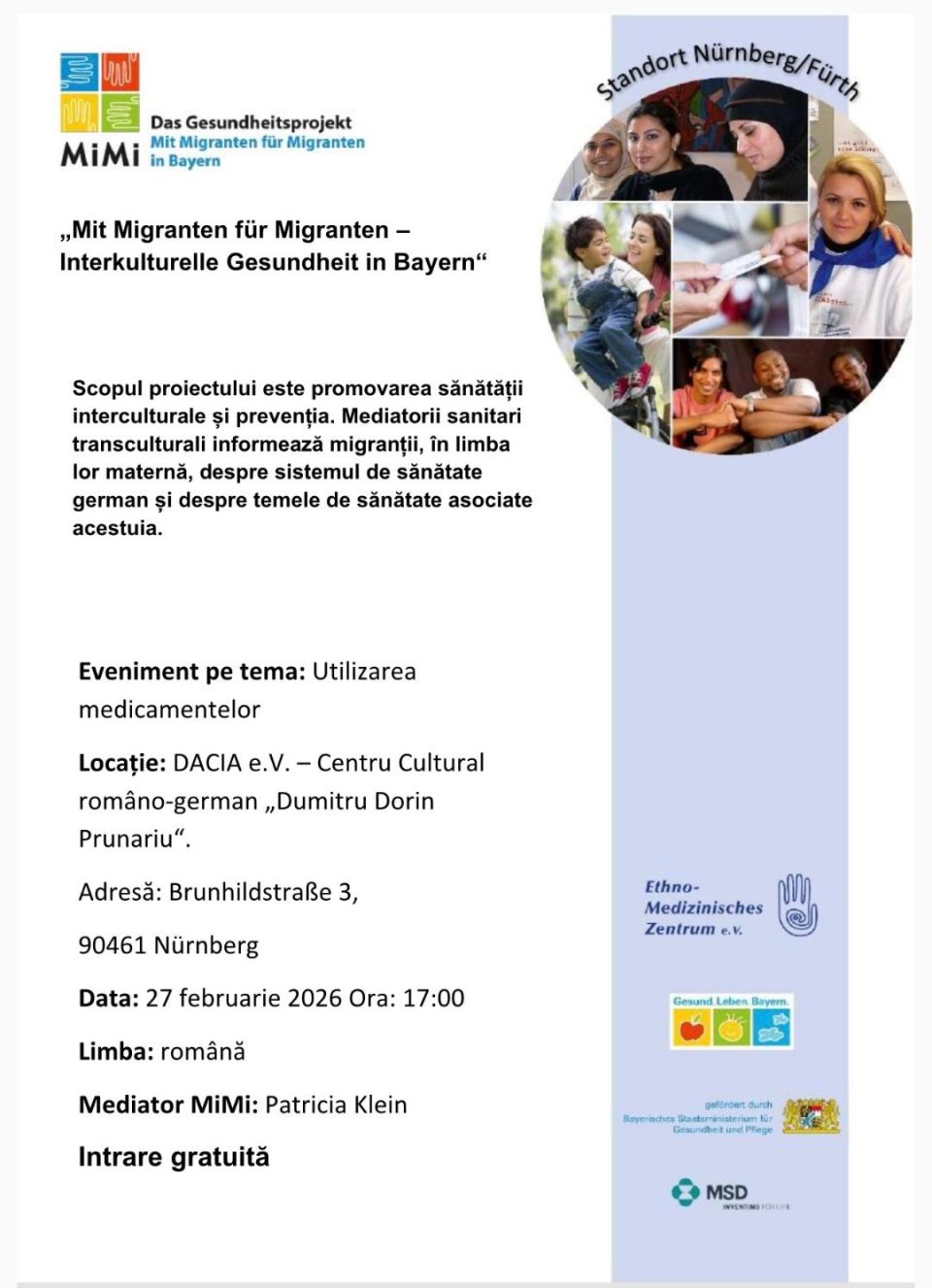 Centrul Cultural Româno‑German Dumitru Dorin Prunariu invită publicul interesat la un seminar gratuit dedicat promovării sănătății interculturale și prevenției, organizat în cadrul proiectului MiMi – mediatori sanitari transculturali.