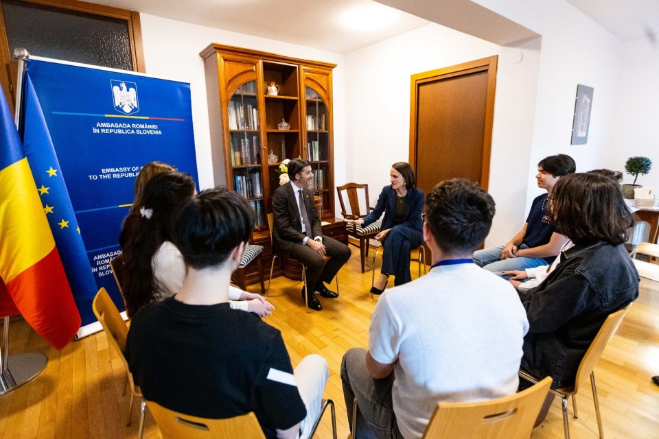 Ministrul Oana Țoiu s-a întâlnit apoi, la sediul Ambasadei României în Republica Slovenia, cu membrii echipei naționale a României participantă la Olimpiada Internațională de Iarnă de Inteligență Artificială. Ministrul i-a felicitat pe elevii români pentru rezultatele deosebite obținute în cadrul competiției, care a reunit peste 120 de tineri din 38 de țări.