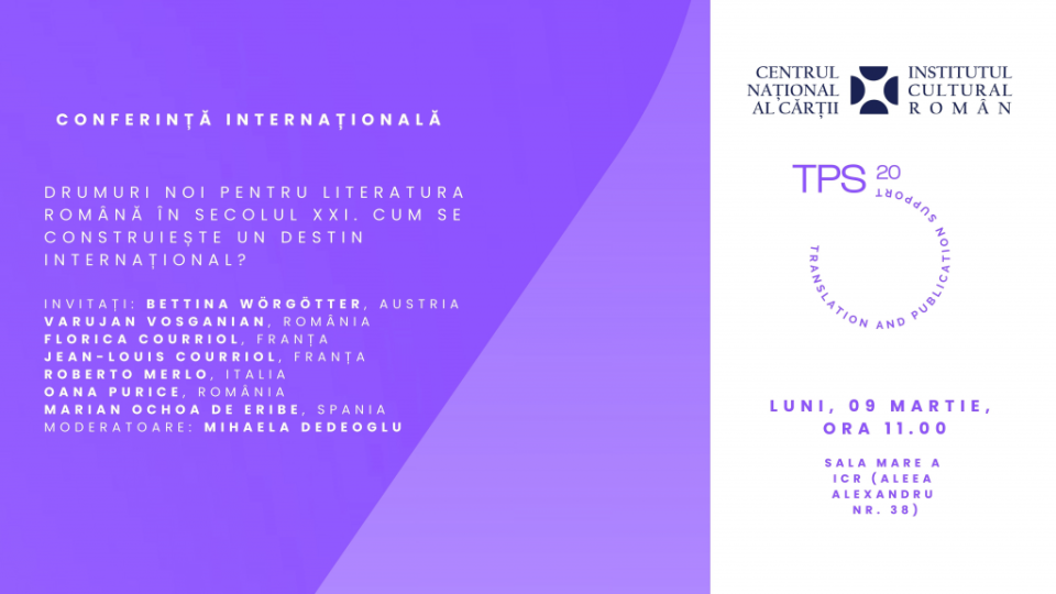 Institutul Cultural Român prin Centrul Național al Cărții organizează luni, 9 martie, de la ora 11.00, la Sala Mare a ICR (Aleea Alexandru nr. 38) conferința internațională „Drumuri noi pentru literatura română în secolul XXI. Cum se construiește un destin internațional?”