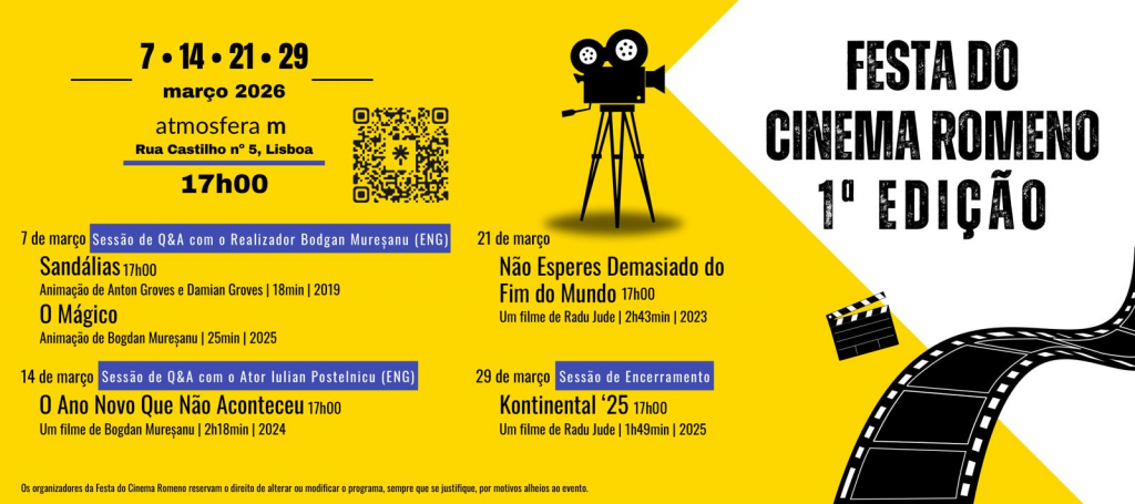 Institutul Cultural Român de la Lisabona este partener al primei ediții a Festivalului Filmului Românesc/Festa do Cinema Romeno, organizat de grupul Zvâc în capitala Portugaliei. În zilele de 7, 14, 21 și 29 martie 2026, publicul va putea descoperi cinematografia românească de autor la Espaço Atmosfera M, într-o serie de proiecții care reunesc filme, cineaști și povești românești captivante.