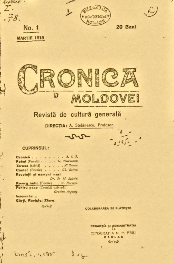 În martie 1915 îl găsim prezent în paginile acestei publicaţiei pe George Bacovia cu „Amurg antic”, poezie, ce are ca subiect sfârşitul existenţial, ce fusese mai întâi publicată în „Revista idealistă de la Botoşani” (în 1902). Barbu Lăzăreanu, istoricul literar și unul dintre directorii Bibliotecii Academiei Române, în timp ce lucra la această ultimă revistă descoperi pe biroul lui poezia bacoviană, însoţită de rezoluţia „la coş”. „Dar când o citi, acesta o găsi foarte frumoasă, de o izbitoare noutate, şi, în loc de a o arunca la coş, o trimisese pe răspunderea proprie la tipar. Aşa a apărut „Amurg antic” în revista de la Botoşani, în 1902”. (Ibidem).