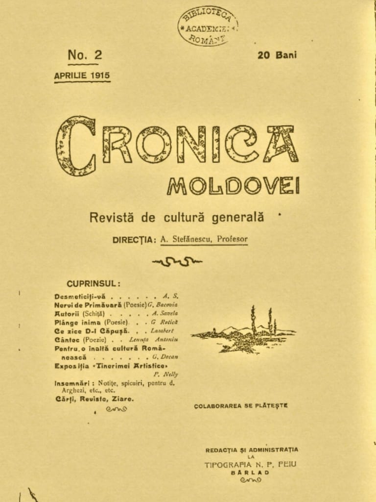 Revista de cultură generală „Cronica Moldovei” a apărut la Bârlad, în martie – aprilie 1915, apoi s-a tipărit la București, în perioadele: mai 1915 – iunie 1916 şi noiembrie 1918 – 15 aprilie 1919. Pe parcurs, în iunie 1916 i se modifică titlul în „Revista critică”, iar, din noiembrie 1918, primește un nume nou, „Cartea vremii”.