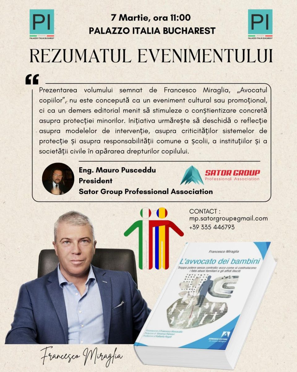 În 7 martie acest an, a avut loc  la București lansarea unei cărți inedite cel puțin în spațiul românesc.  Este vorba despre volumul scris de italianul Francesco Miraglia  ,, Avocatul copiilor“, o apariție editorială menită să conștientizeze necesitatea protejării minorilor într-un context global tot mai complex.  Fațetele agresiunii contra  copiilor au devenit foarte nuanțate odată cu generalizarea accesului la internet.