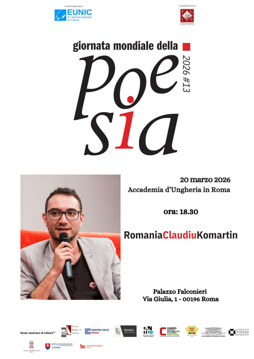 Evenimentul are loc vineri, 20 martie 2026, la ora 18:30, la Accademia d’Ungheria in Roma (Palazzo Falconieri, Via Giulia 1). Seara va fi moderată de Maria Ida Gaeta, vicepreședinte al Comitetului de la Roma al Società Dante Alighieri, și va reuni poeți din zece țări membre și asociate ale EUNIC – European Union National Institutes for Culture.