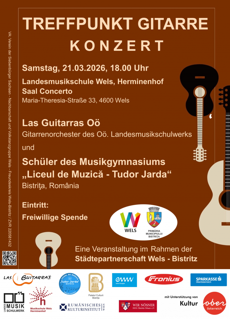 Institutul Cultural Român de la Viena este partener al concertului „Treffpunkt Gitarre”, ce reunește orchestra de chitare Las Guitarras din cadrul Școlii de Muzică din Austria Superioară, sub conducerea lui Markos Destefanos, directorul departamentului, și elevi ai secției de chitară clasică din cadrul Liceului de Muzică„Tudor Jarda“ din Bistrița, sub conducerea lui Valentin Pop. Evenimentul va avea loc sâmbătă, 21 martie 2026, de la ora 18.00, în sala Concerto a Școlii de muzică regională din orașul Wels.