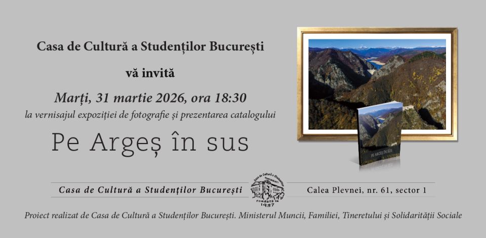 Marți, 31 martie 2026, ora 18:30, la Casa de Cultură a Studenţilor Bucureşti din Calea Plevnei nr. 61, sector 1, va avea loc vernisajul expoziţiei şi prezentarea catalogului Pe Argeș în sus, din cadrul proiectului Romania Student Tour – program naţional de redescoperire şi promovare a valorilor patrimoniului natural şi cultural. Evenimentul va include vernisajul și lansarea albumului, video-prezentări, expoziție de comori vestimentare și un recital de muzică Mircea Baniciu & Band și Lorena Oltean. Festivitatea va fi transmisă on line și live-streamed pe https://www.facebook.com/Fotogeografica.