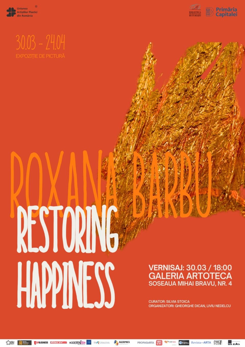 Expoziția „Restoring Happiness”, curatoriată de artista Silvia Stoica, propune publicului cea mai recentă serie de lucrări realizate de Roxana Barbu, care au ca numitor comun preocuparea pentru vibrația cromatică, expresivități ale materiei, relația dintre materie și culoare, dinamica gestului și forța semnului plastic. Pluristratificate și realizate în tehnici mixte, lucrările ajung adesea la granița cu tridimensionalul unde lumina exterioară modelează relieful pictural contribuind la pulsația continuă a compoziției.