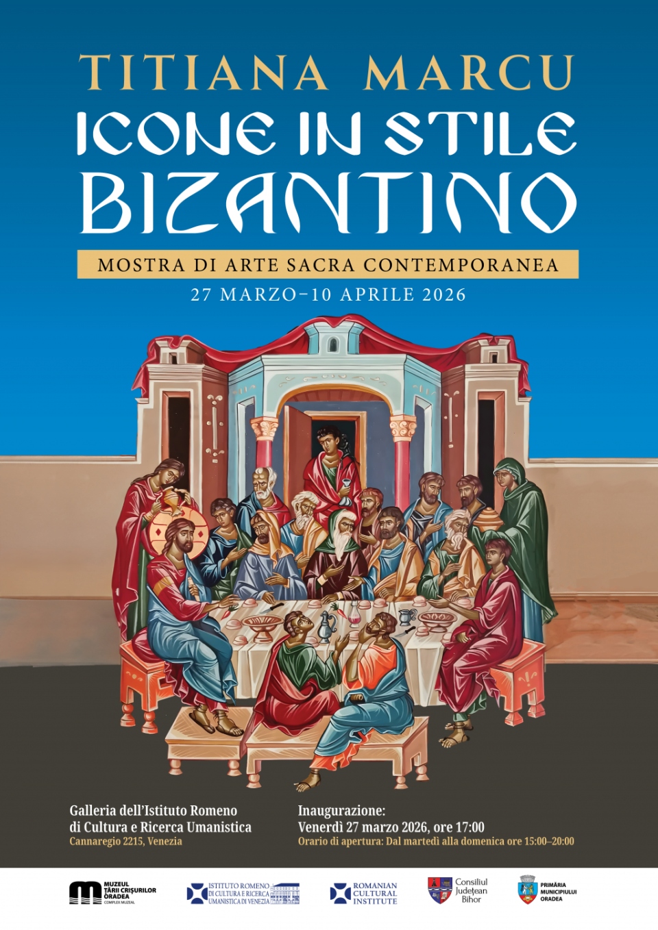 Cu prilejul Sărbătorilor Pascale, Muzeul Ţării Crişurilor din Oradea şi Institutul Român de Cultură şi Cercetare Umanistică de la Veneţia aduc în atenţia publicului din Italia tradiţia icoanelor de factură bizantină, pictate pe lemn, într-o expoziţie ce prezintă publicului vizitator iconografia specifică lumii ortodoxe româneşti. Realizate de artista Titiana Marcu, în tehnica ulei şi pigmenţi / oxizi pe suport rigid din lemn, cele 30 de icoane, de dimensiuni variabile, vor fi expuse pe simeza Galeriei Institutului Român de Cultură şi Cercetare Umanistică, Cannaregio 2215, Veneţia. Expoziţia va fi deschisă publicului în perioada 27 martie – 10 aprilie 2026, în intervalul orar 15:00-20:00.