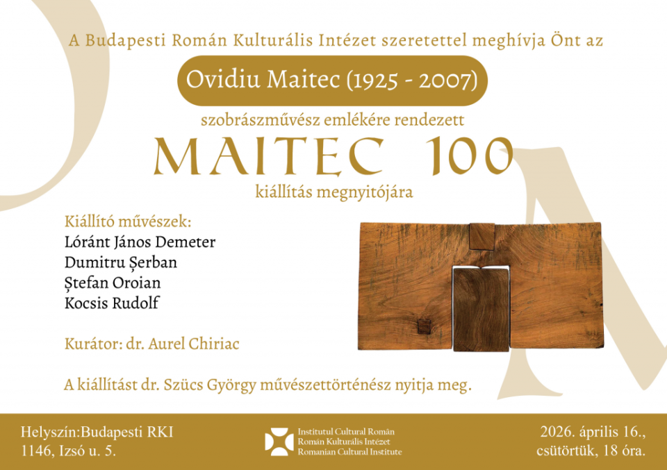 Institutul Cultural Român de la Budapesta organizează expoziția omagială „Maitec 100”, dedicată memoriei sculptorului român Ovidiu Maitec (1925-2007), una dintre personalitățile majore ale artei românești. Expoziția reunește lucrările a patru artiști contemporani – Ștefan Oroian și Lóránt János Demeter (Ungaria), și Dumitru Șerban și Kocsis Rudolf (România) – care propun creații realizate ca omagiu adus lui Ovidiu Maitec. Prin această întâlnire artistică, proiectul creează un dialog între generații și spații culturale, punând în valoare impactul durabil al operei sculptorului.