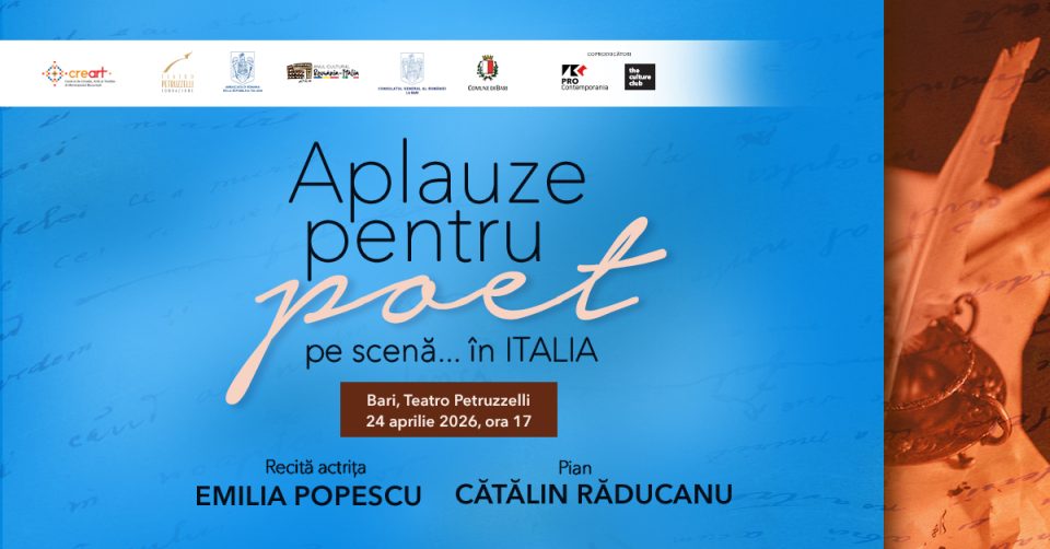 După succesul cu spectacolul Aplauze pentru poet pe scenă… în Italia, la Roma, Milano şi Bologna, din 2024şi Aplauze pentru poet pe scenă… în Spania, laBarcelona, Madrid și Valencia, din 2025,actrița Emilia Popescu șipianistul Cătălin Răducanu, ajung, pe 24 aprilie 2026, ora 17, într-o nouă formulă de spectacol, la Bari, în fermecătorul oraș-port din sudul Italiei,situat pe malul Mării Adriatice.