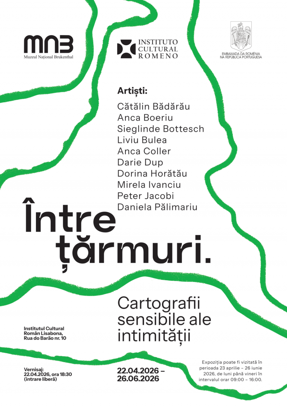 Institutul Cultural Român din Lisabona, în colaborare cu Muzeul Național Brukenthal din Sibiu, organizează, expoziția „Între țărmuri. Cartografii sensibile ale intimității” la Galeria ICR Lisabona (Rua do Barao, nr. 10, Lisabona) în perioada 22 aprilie – 26 iunie 2026. Vernisajul va avea loc în data de 22 aprilie începând cu ora 18.30 la Galeria ICR Lisabona în prezența curatorului expoziției, doamna Raluca Teodorescu, directorul Muzeului Național Brukenthal. Expoziția reunește lucrări din colecțiile Muzeului Național Brukenthal Sibiu și lucrări deținute de artiști contemporani români.