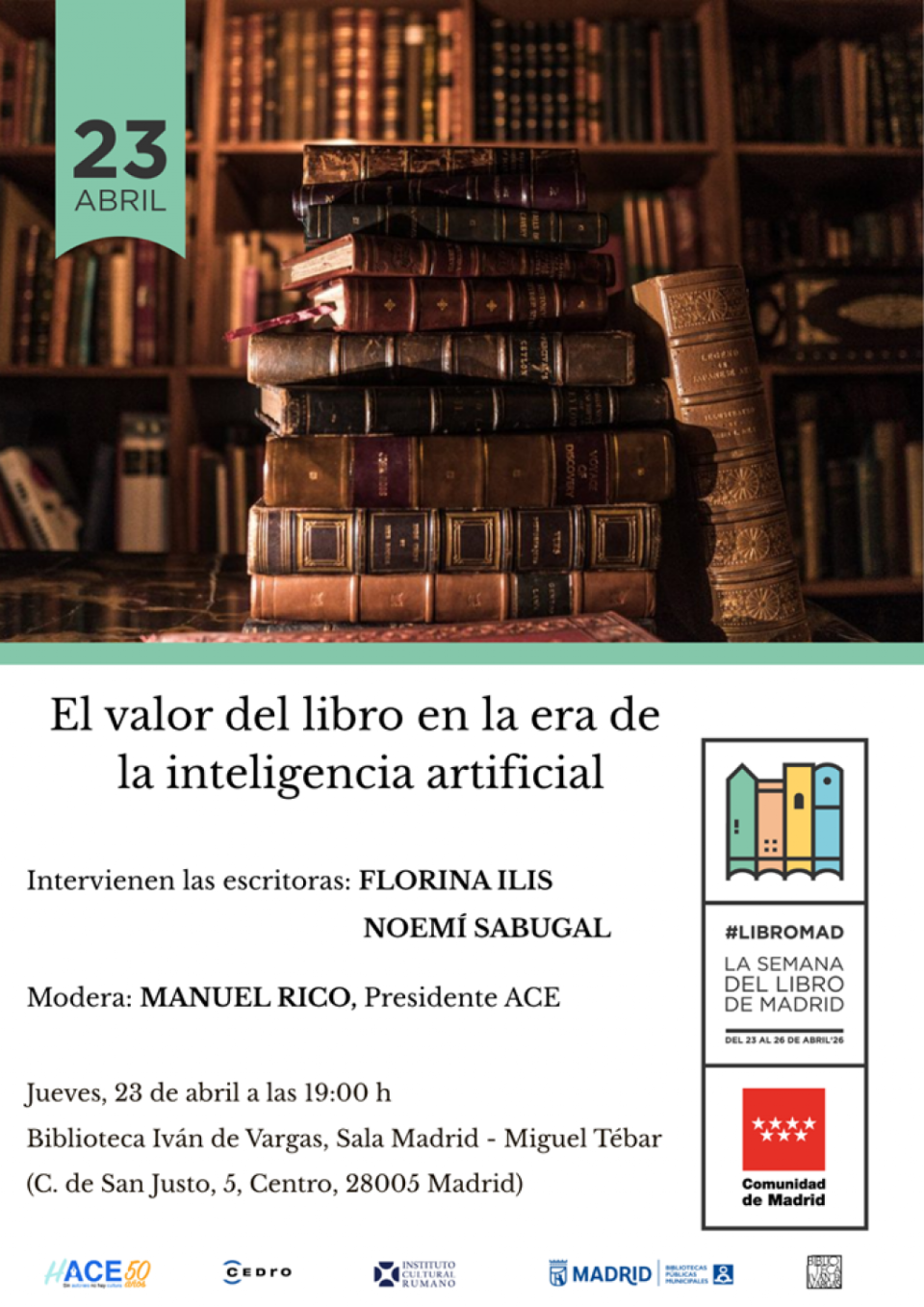 Institutul Cultural Român de la Madrid organizează joi, 23 aprilie 2026, de la ora 19:00, la Biblioteca Ivan de Vargas, dezbaterea intitulată „Valoarea și destinul cărții în era inteligenței artificiale“. Evenimentul are loc în cadrul festivalului LIBROMAD – Săptămâna Cărții din capitala Spaniei, desfășurat între 23 și 26 aprilie, și este realizat în colaborare cu Asociația Scriitoarelor și Scriitorilor din Spania și cu instituția gazdă.