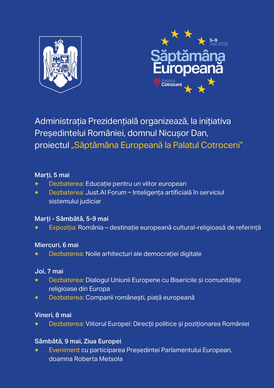 Administrația Prezidențială va organiza, în perioada 5-9 mai 2026, la inițiativa Președintelui României, Nicușor Dan, o serie de evenimente în cadrul proiectului „Săptămâna Europeană la Palatul Cotroceni”.