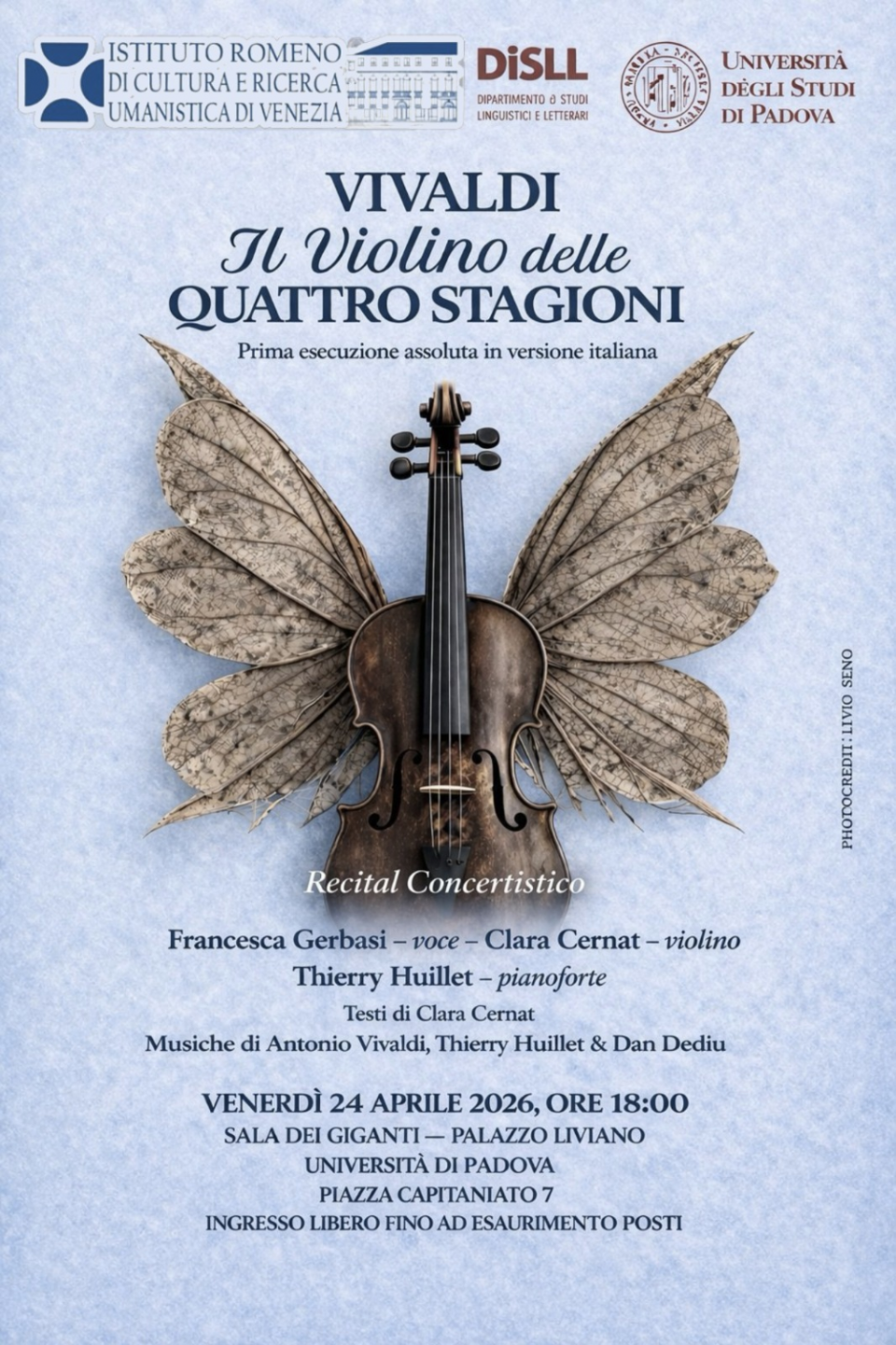 Institutul Român de Cultură şi Cercetare Umanistică de la Veneţia, în colaborare cu Departamentul de Studii Lingvistice şi Literare al Universităţii din Padova organizează recitalul muzical „Vivaldi şi vioara celor Patru Anotimpuri”, susţinut de artiştii Clara Cernat şi Thierry Huillet, alături de mezzosoprana Francesca Gerbasi. În cadrul acestui eveniment, mezzosoprana Francesca Gerbasi va interpreta fragmente din volumul „Il Violino delle Quattro Stagioni”, semnat de Clara Cernat. Evenimentul se va desfăşura vineri, 24 aprilie 2026, ora 18:00, în somptuoasa Sală dei Giganti din Palatul Liviano al Universităţii din Padova, spaţiu de referinţă al memoriei artistice şi academice, cu o capacitate de 200 de locuri.