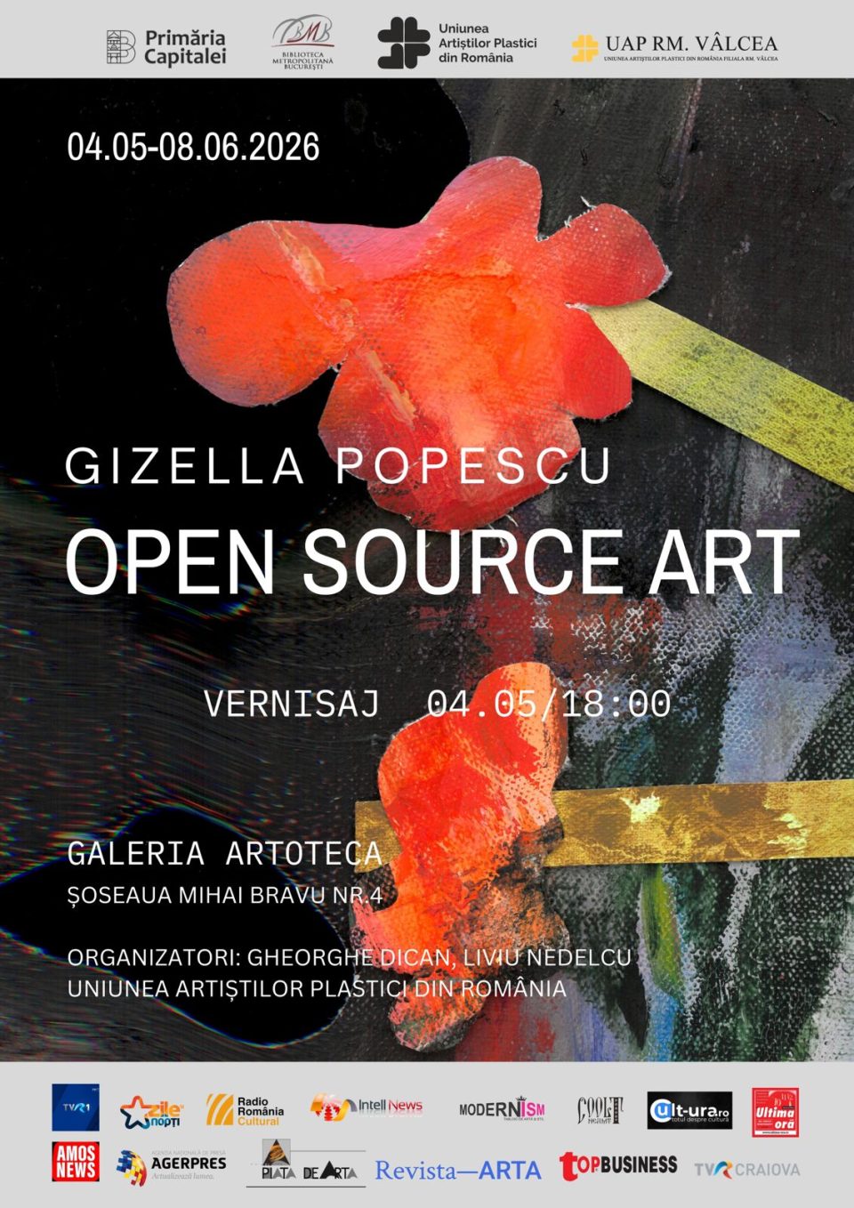 Primăria Municipiului București (PMB), prin Biblioteca Metropolitană București (BMB), în parteneriat cu Uniunea Artiștilor Plastici din România, vă invită luni, 4 mai, de la ora 18:00, la vernisajul expoziției „OPEN SOURCE ART”, un proiect experimental semnat de artista Gizella Popescu. Evenimentul va avea loc la Galeria Artotecii BMB, situată pe Șoseaua Mihai Bravu, nr. 4.